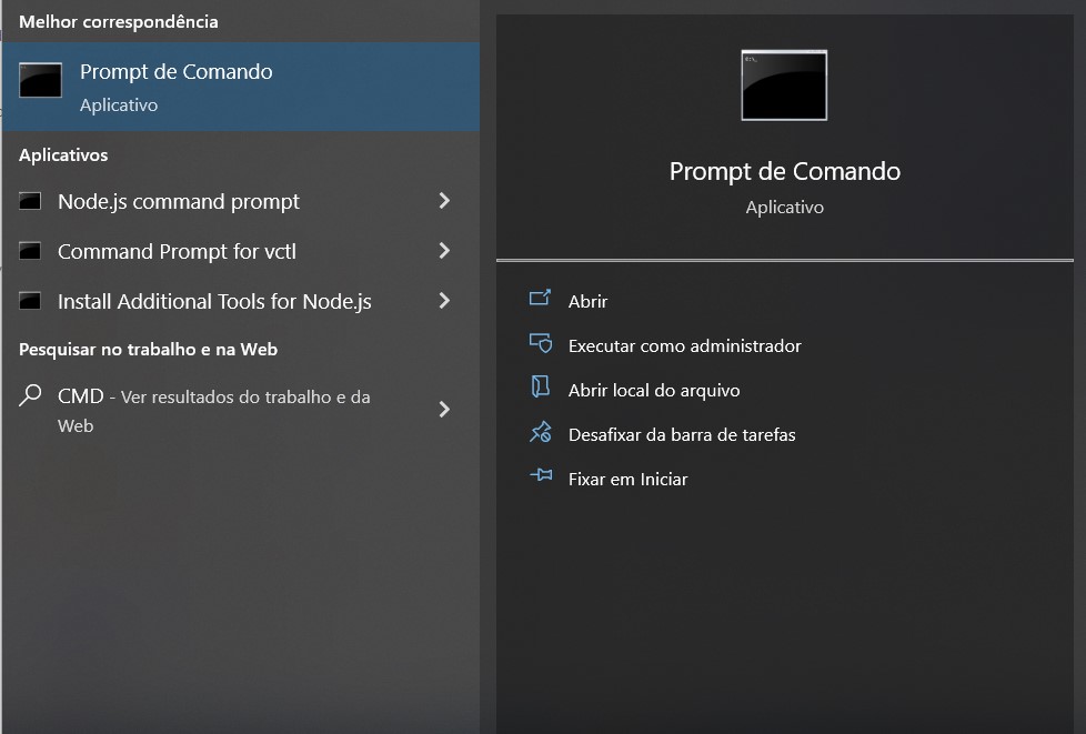 Para executar o teste, primeiro será necessário abrir o Prompt de Comando de seu computador. O Prompt está disponível por meio da barra de pesquisa do seu sistema operacional: